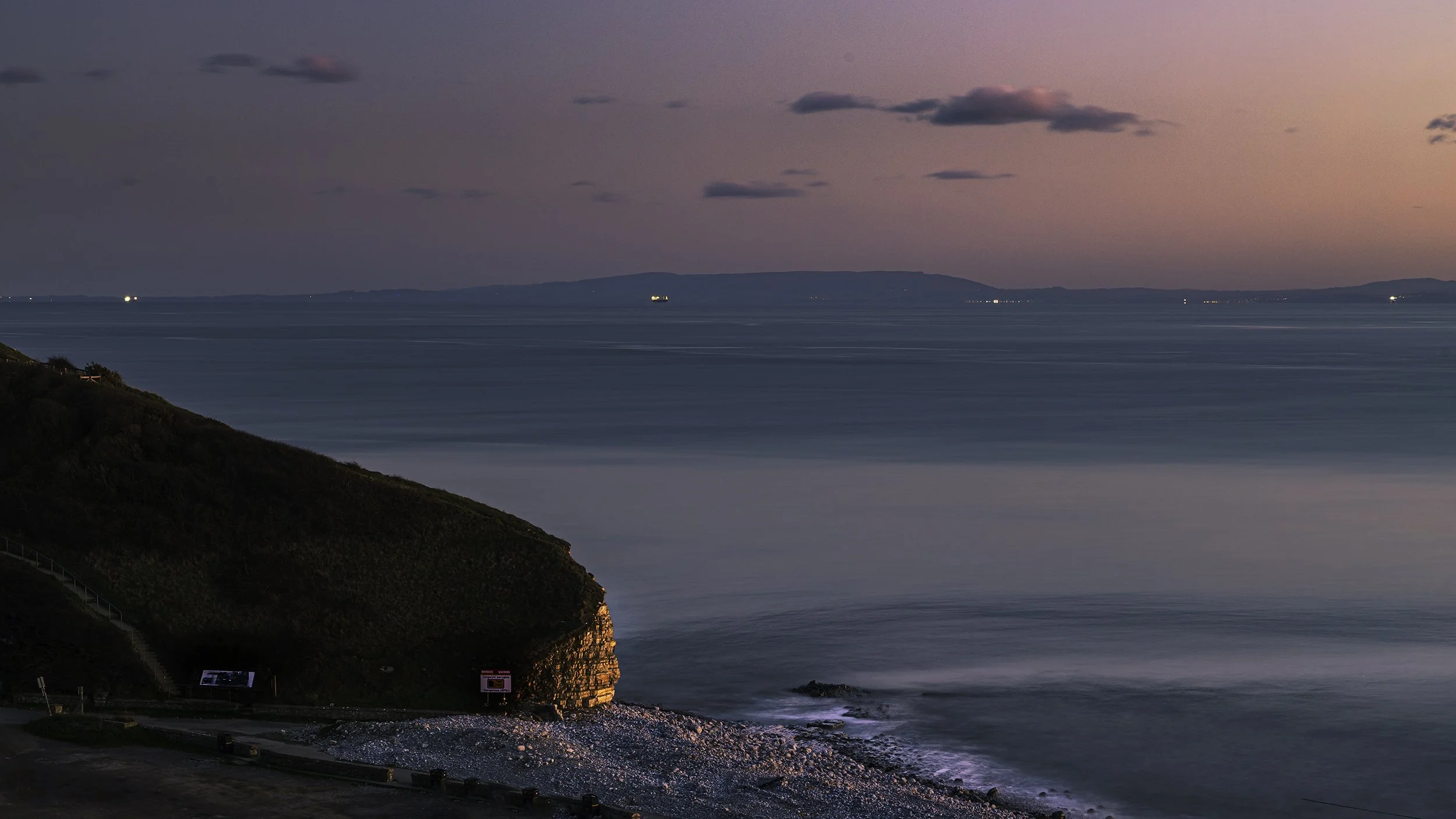This is pure blue hour magic. The sky is a gorgeous, soft gradient of deep purple and dusky pink, transitioning down to the calm, steely blue of the Bristol Channel. The long exposure has flattened the water into an almost mirror-like surface, creating a beautiful contrast between the smooth sea and the rugged land. The focus is on the profile of the dark, grassy cliff on the left, which is punctuated by a brightly lit section of the cliff face and the pebbled shore below. In the distance, the hills are silhouetted against the horizon, and you can clearly see the tiny lights of shipping vessels dotted across the Channel. It's a peaceful, atmospheric shot that captures the tranquility of the coast long after sunset.