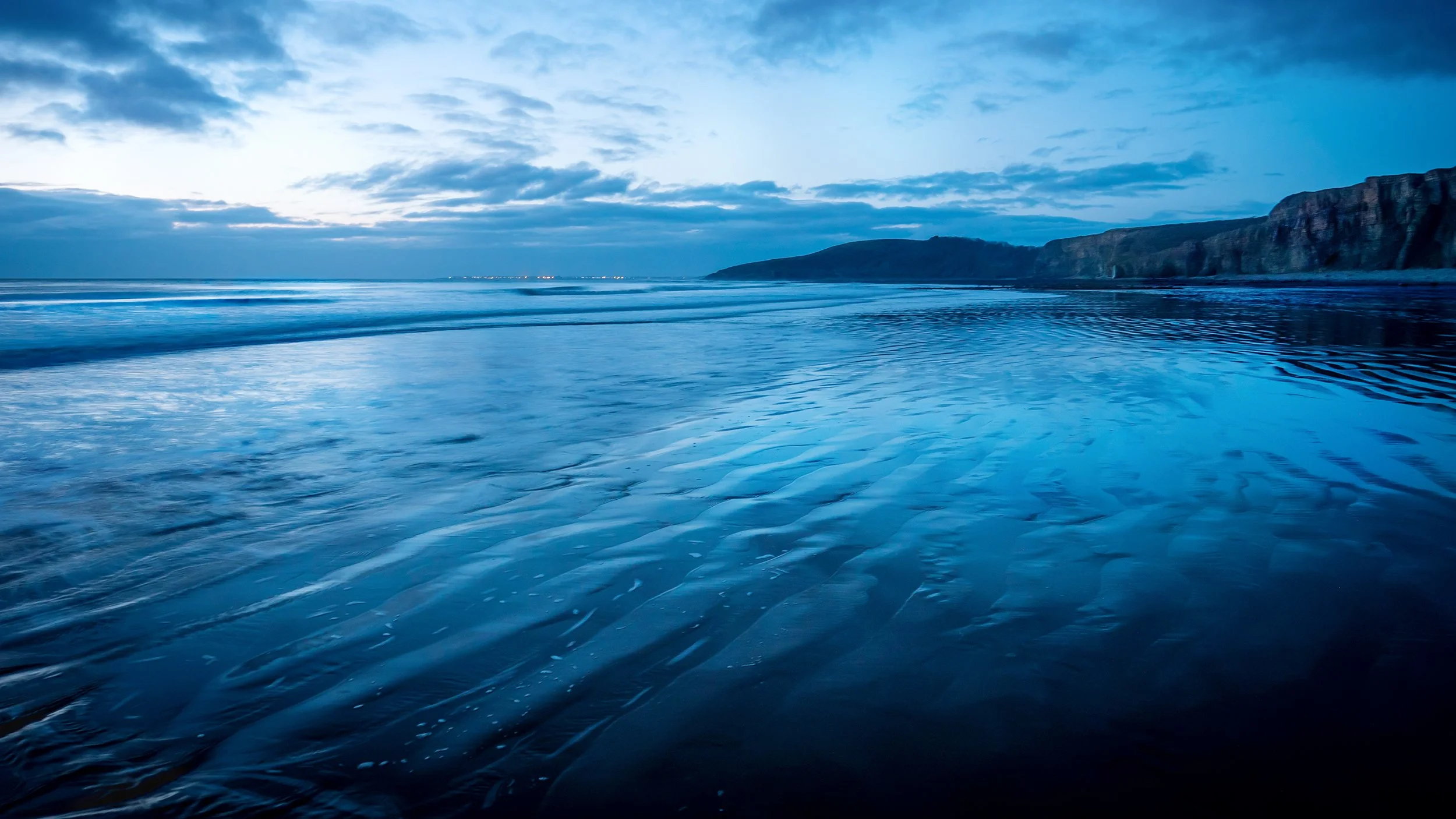 Blue hour turns the beach into satin.