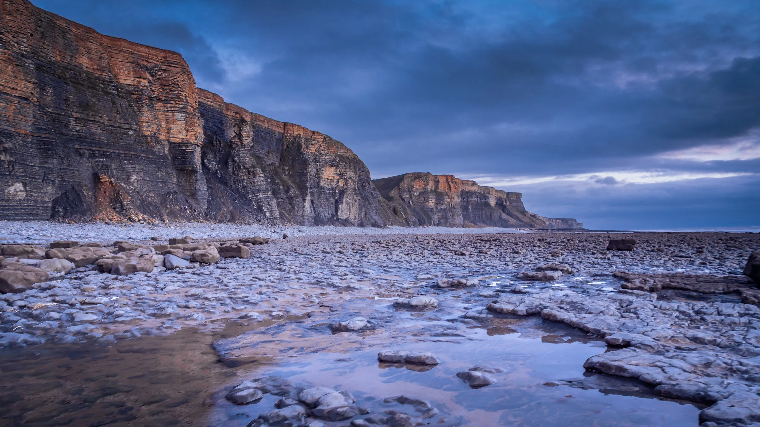 Cliffs catching warm light, rock pool foreground.