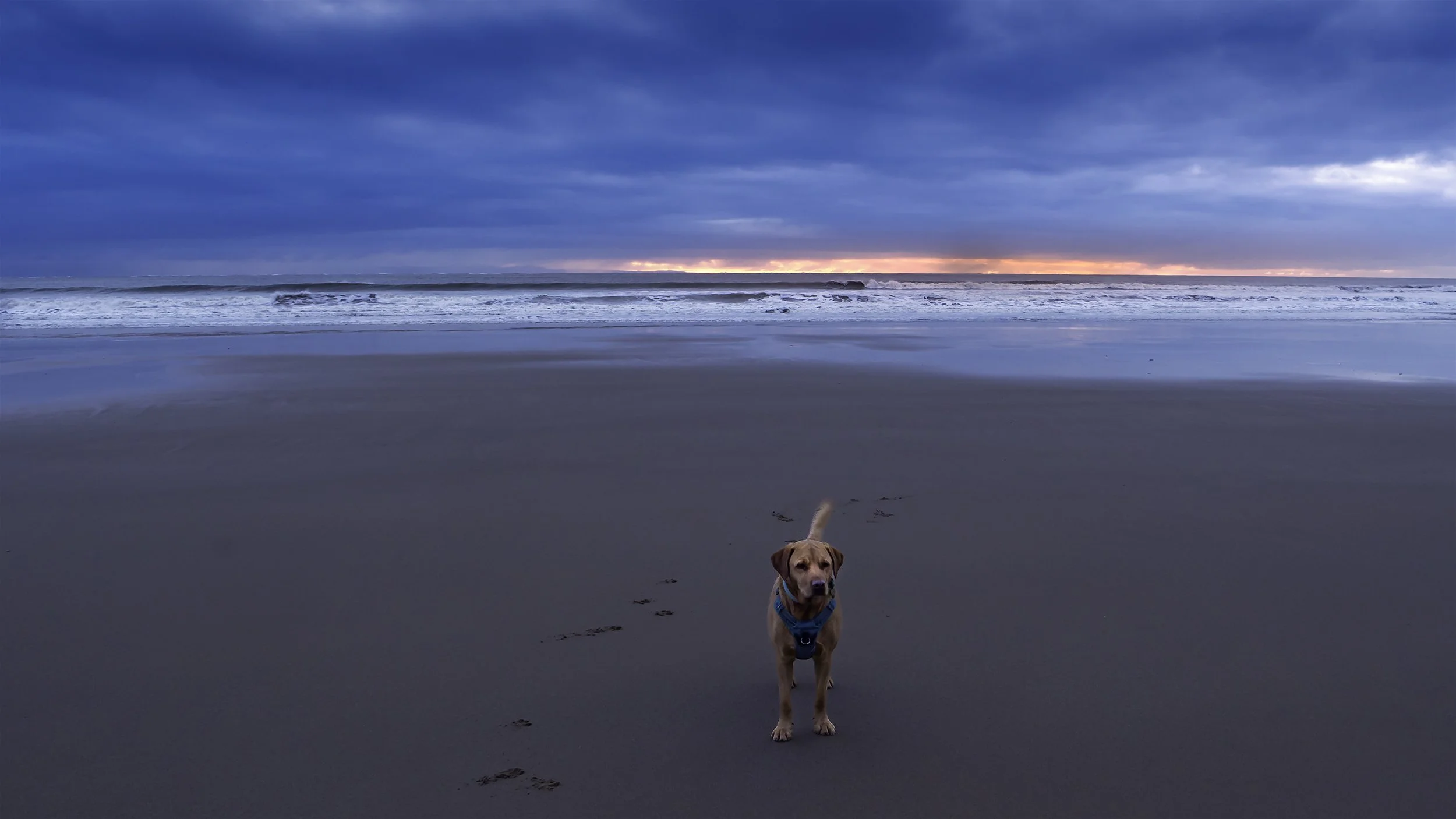 Toby found a stretch of wet sand and suddenly transformed into a professional model. He stood there, staring out at the dusk line on the horizon as if he were contemplating the deep mysteries of the universe. In reality, he was likely wondering if a seagull would be foolish enough to land within a fifty-yard radius. I felt a surge of pride, though. He’s a handsome lad, even if he does judge my walking pace.